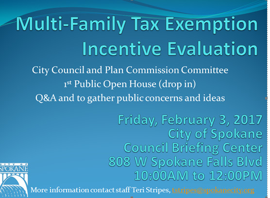 The City Council and Plan Commission Committee are holding their first (drop in) open house regarding multi-family tax exemption incentive evaluation. The event will be held on Friday, February 3 from 10:00am-12:00pm at the City of Spokane Council Briefing Center (800 W Spokane Falls Blvd). For more information, contact Teri Stripes, tstripes@spokanecity.org.