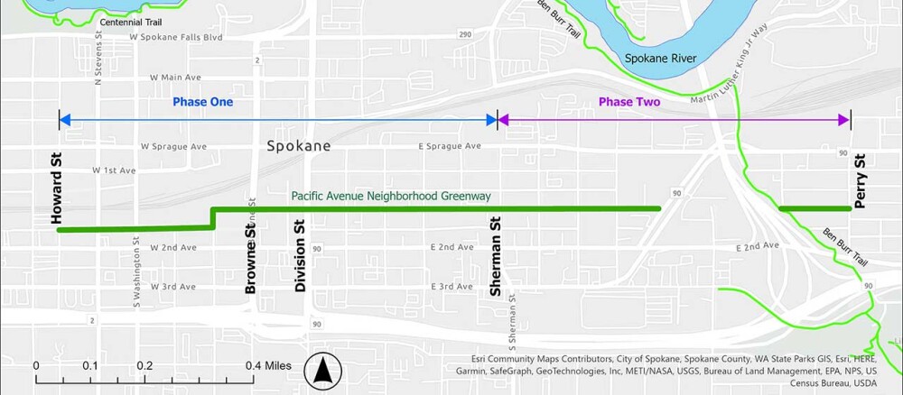 The Pacific Avenue Neighborhood Greenway, proposed in Spokane’s Bicycle Master Plan, will provide a safe route for people walking, bicycling and rolling between downtown and the University District. View the Alignment Recommendation Report for Phase 2 (PDF 9.3 MB).