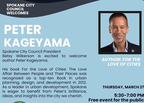 Spokane City Council President Betsy Wilkerson will host a free community event featuring guest speaker Peter Kageyama. In 2012, Kageyama's book, “For the Love of Cities: The Love Affair Between People and Their Places”, was recognized as one of the top ten books in urban planning, design, and development.