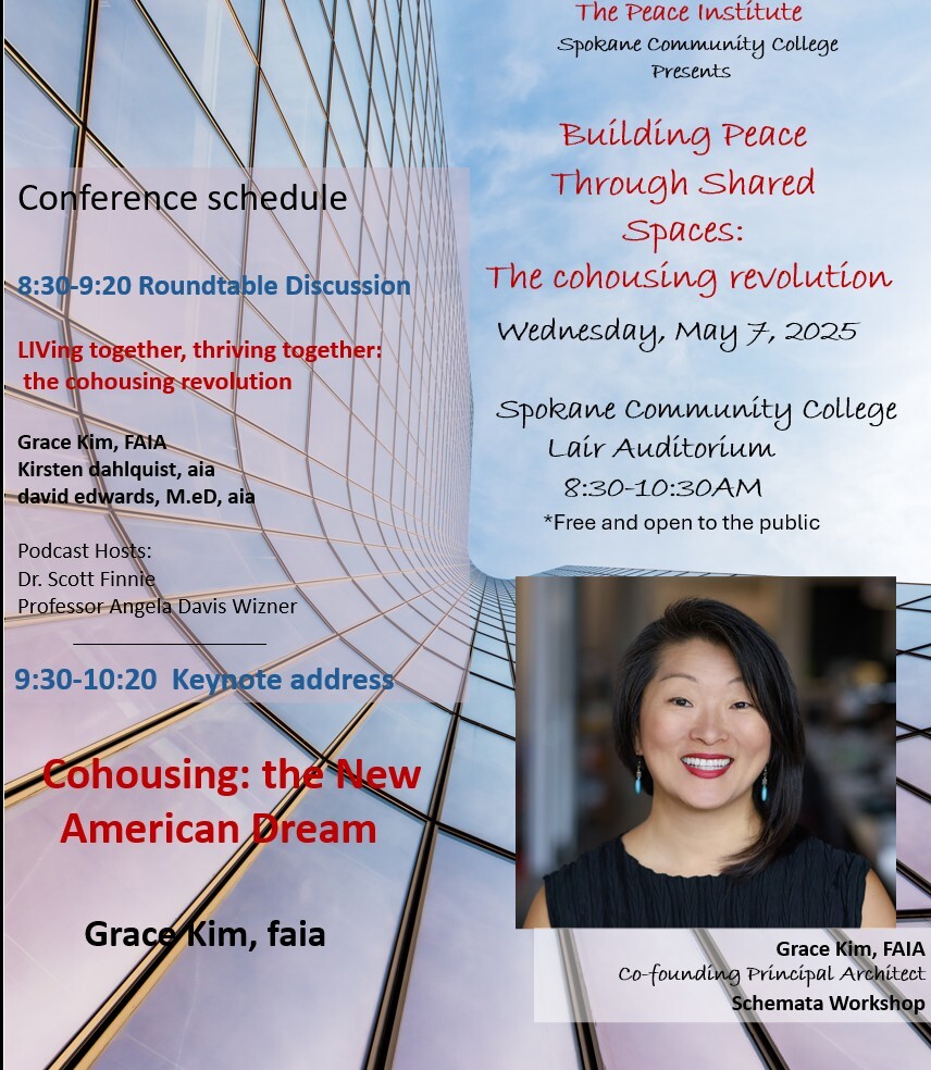 The Peace Institute and Spokane Community Colleges present "Building Peace Through Shared Spaces: The Cohousing Revolution" on May 7 at Spokane Community College Lair Auditorium. Free and open to the public.