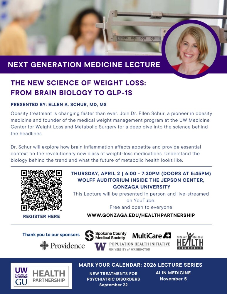 The UW School of Medicine - Gonzaga University Health Partnership just announced their Next Generation Medicine Lecture for Thursday, April 2nd, featuring Ellen A. Schur, MD. As an internal medicine physician and founder of the UW Medicine Center for Weight Loss and Metabolic Surgery, she will be diving into the new science of weight loss. Don't miss out and register today! As always, admission is free. Please see below for more event details.